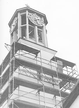 Daraus entstand der architektonische Plan, ihn zu erhöhen und mit einer neuzeitlichen Stahlbetonlaterne zu versehen, deren hochragende, durchsichtige Konstruktion nicht nur für 4 Glocken Platz bieten konnte, sondern auch die weitsichtbare Anbringung großer Ziffernblätter einer neuen Turmuhr ermöglichte.